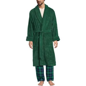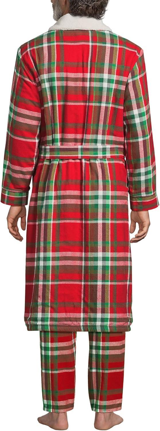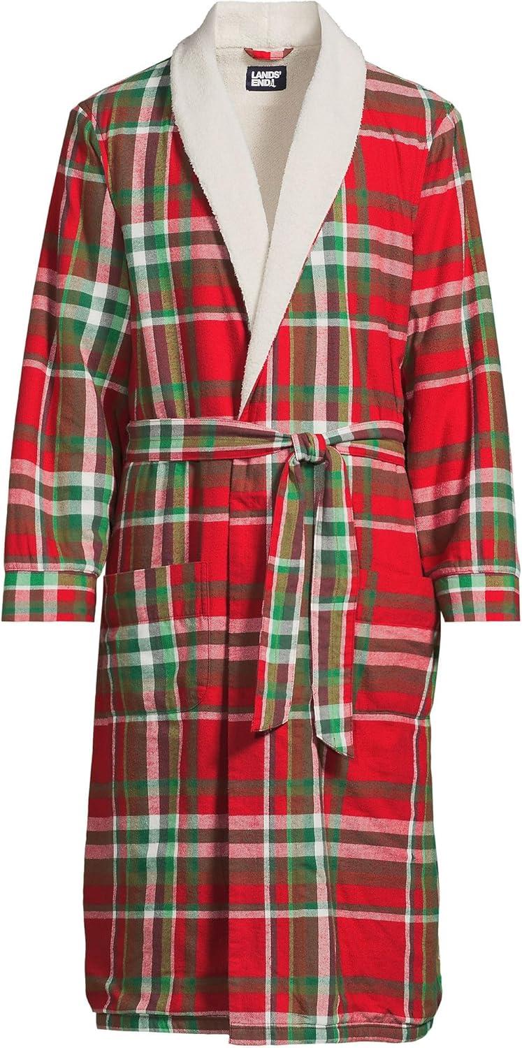 Lands’ End Men’s Sherpa Fleece Lined Flannel Robe(Compass Red/Emerald Plaid)