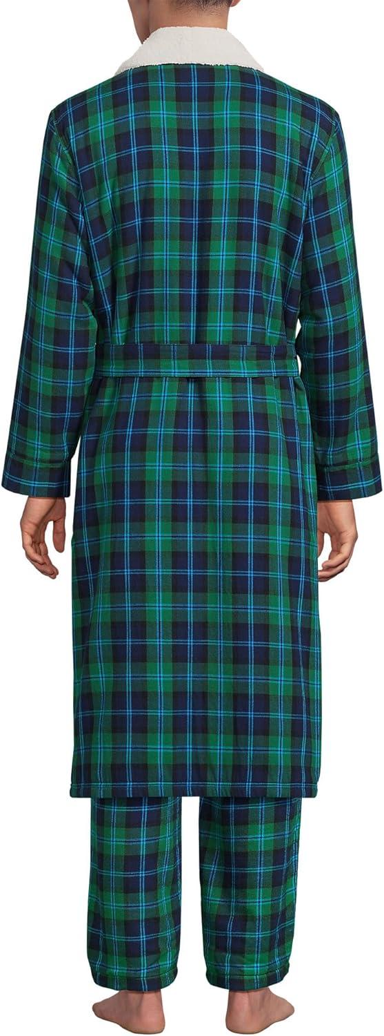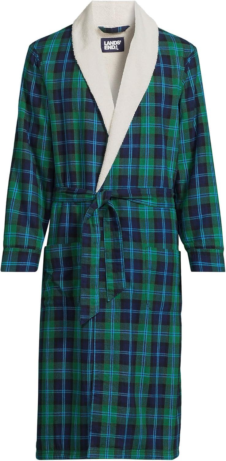 Lands’ End Men’s Sherpa Fleece Lined Flannel Robe(Light Emerald Blackwatch)