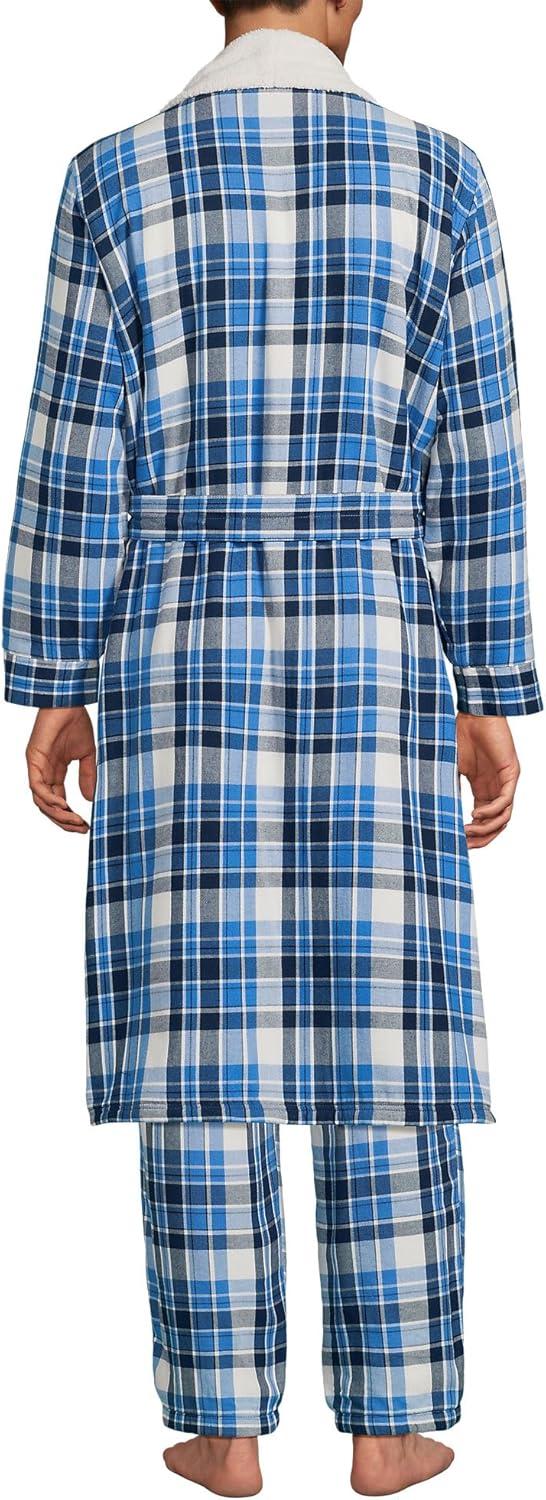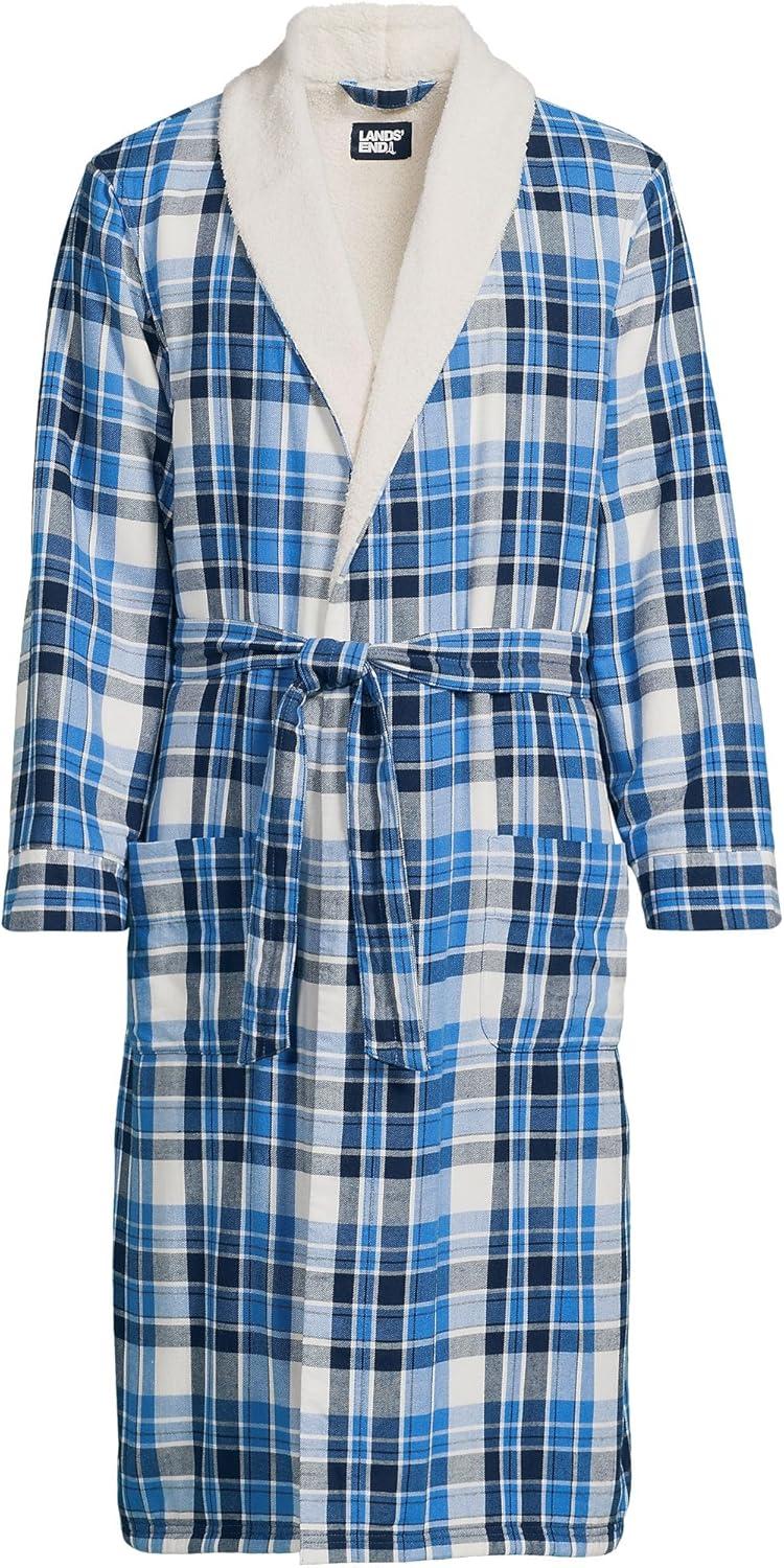 Lands’ End Men’s Sherpa Fleece Lined Flannel Robe(Muted Cobalt Blue Plaid)