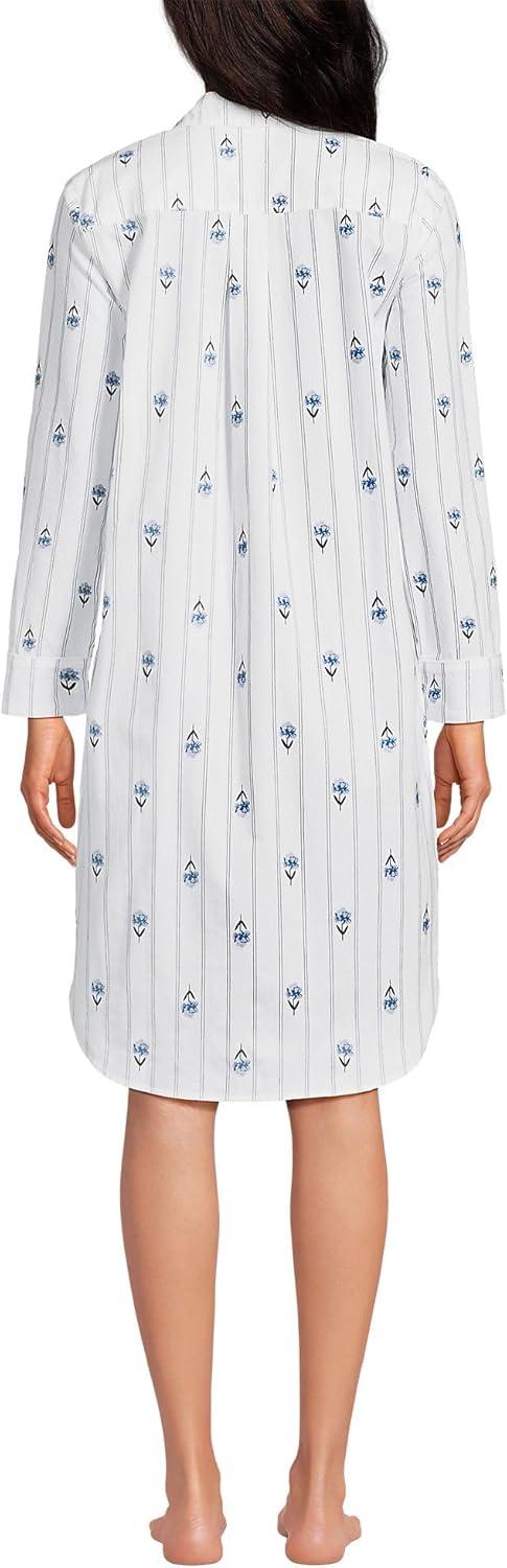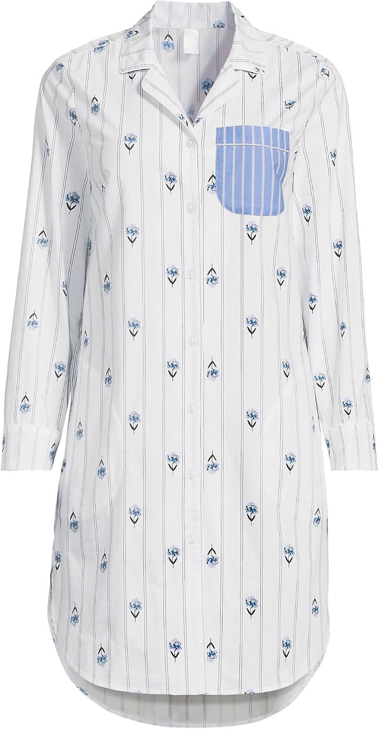 Lands’ End Women’s Cotton Poplin Long Sleeve Sleepshirt Nightgown(White/Blue Floral Stripe)