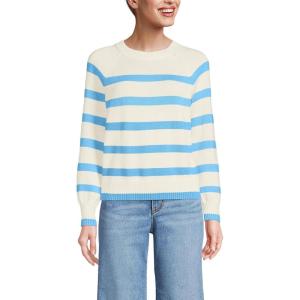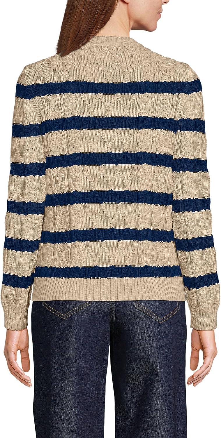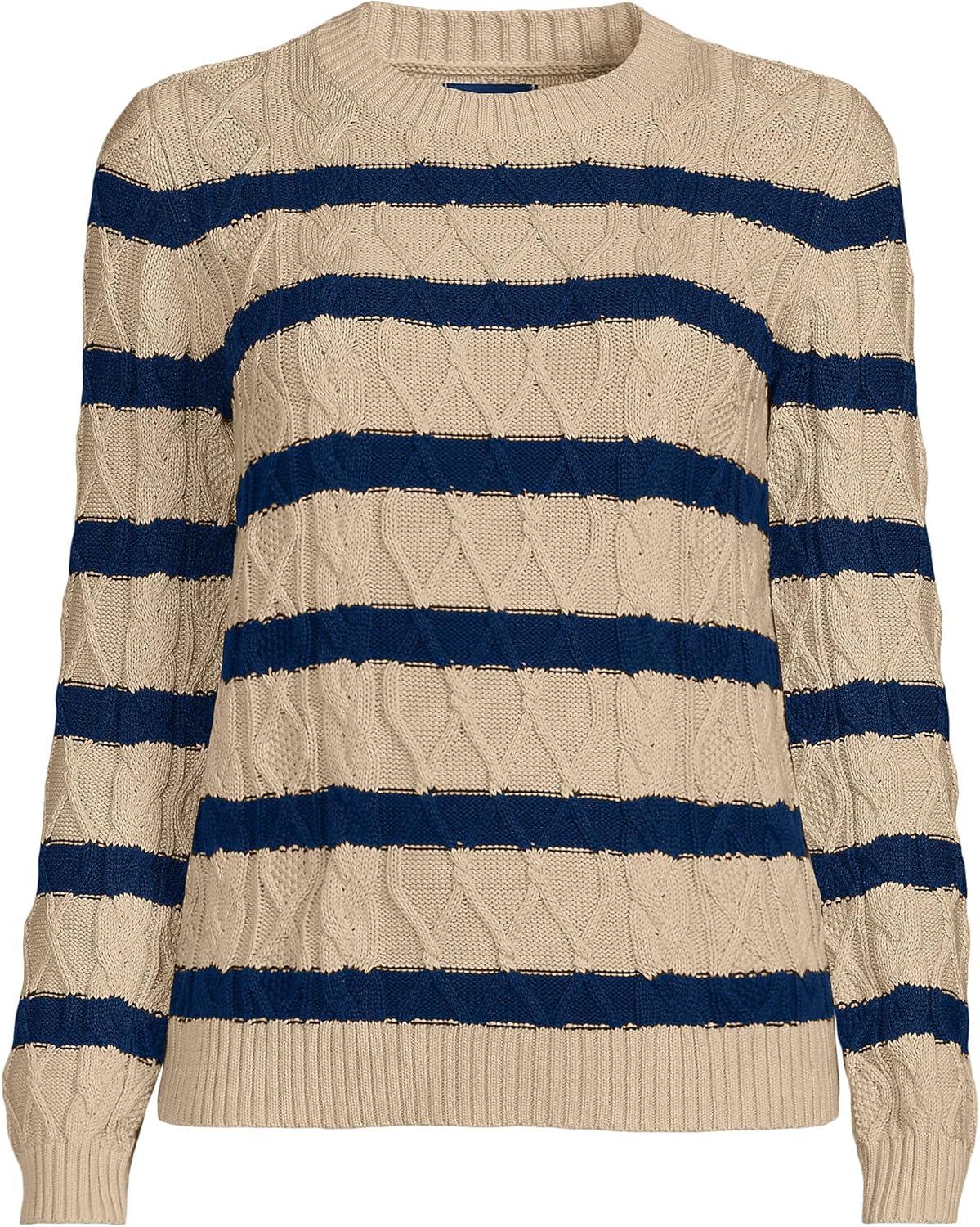 Lands’ End Women’s Cotton Drifter Crew Cable Pullover Sweater(Champagne/Deep Sea Gulf Stripe)