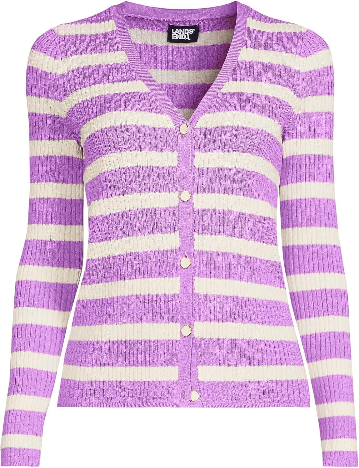 Lands’ End Women’s Drifter Baby Cable Vneck Cardigan Sweater(Fresh Ivory/Orchid Stripe)
