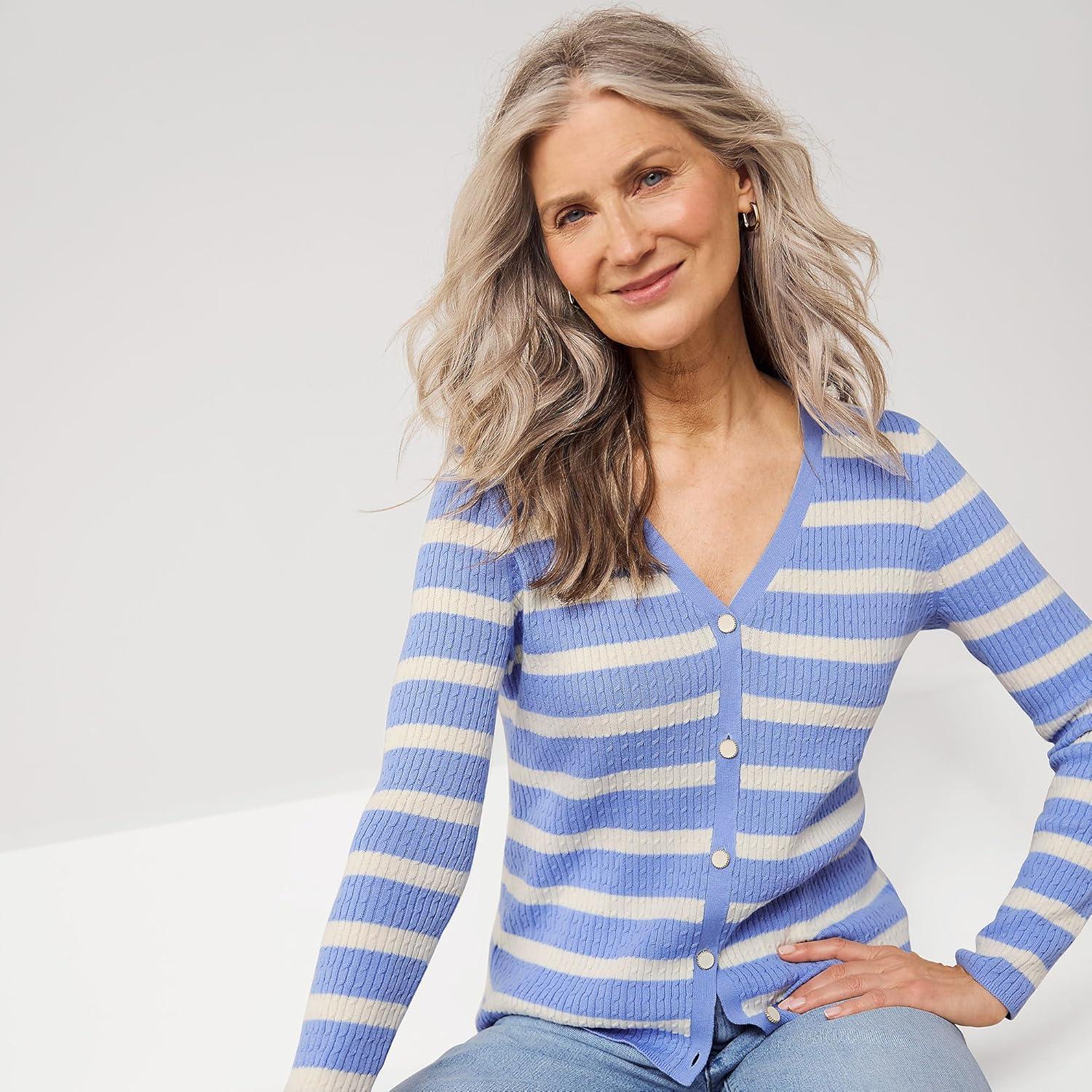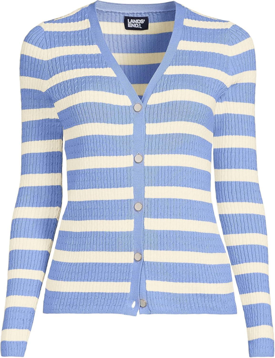 Lands’ End Women’s Drifter Baby Cable Vneck Cardigan Sweater(Fresh Ivory/Periwinkle Stripe)