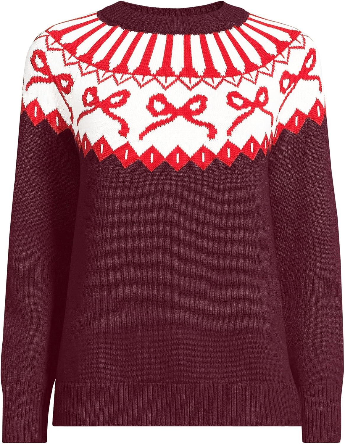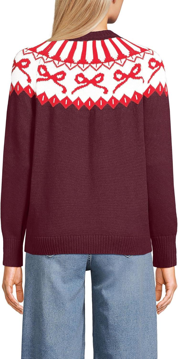 Lands’ End Women’s Drifter Jacquard Raglan Crew Neck Sweater(Burgundy Bow Fairisle)