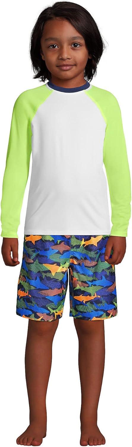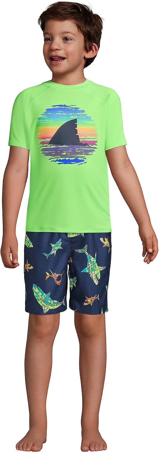 Lands’ End Boys Chlorine Resistant Short Sleeve UPF 50 Rash Guard Swim Trunk Set(Neon Green Sharks)