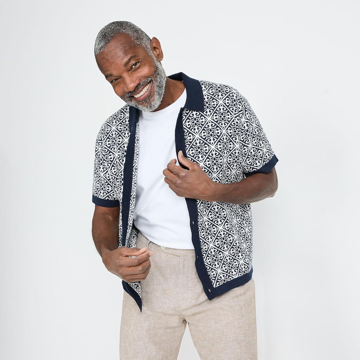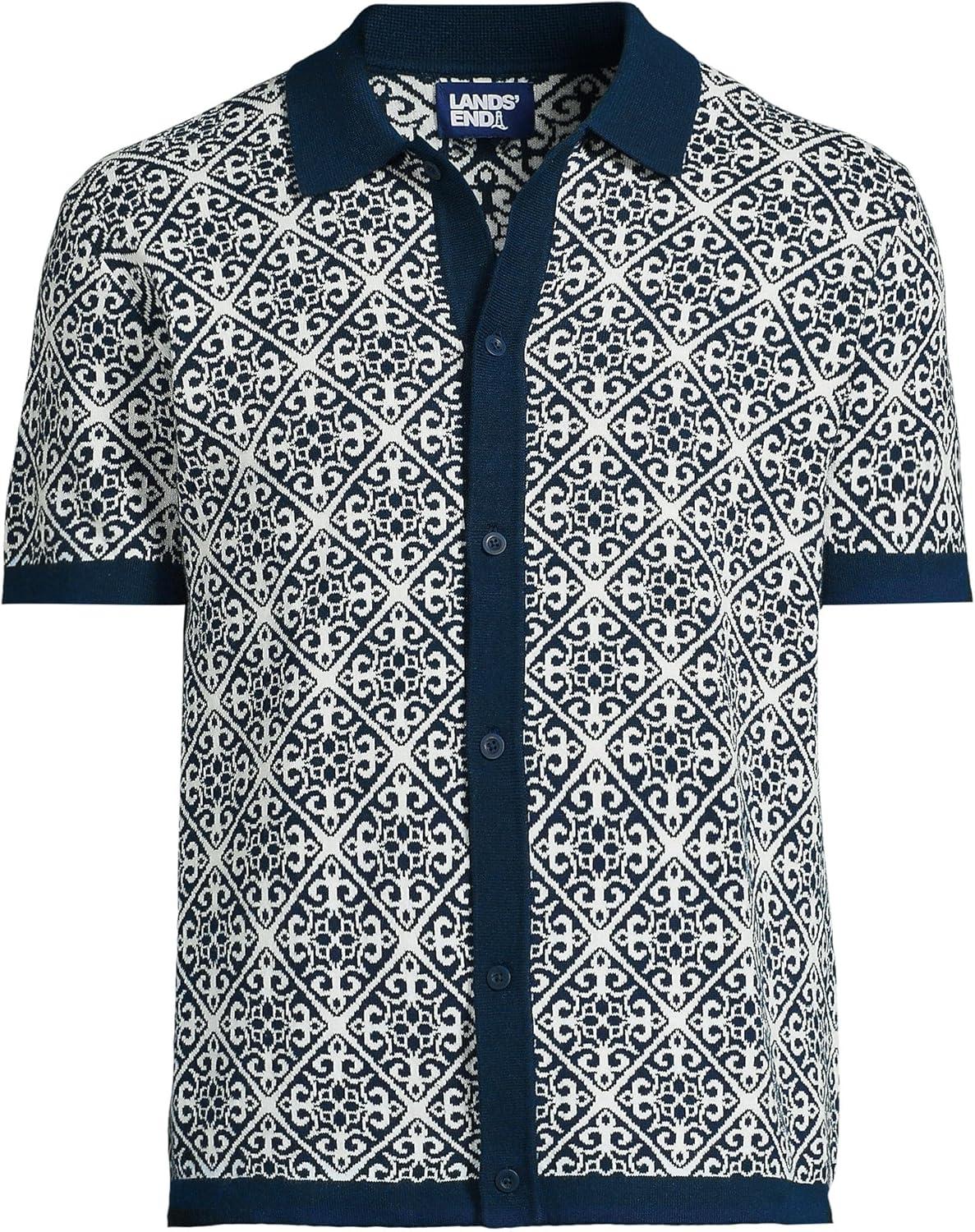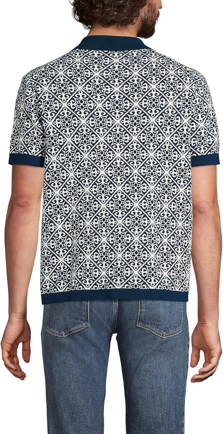 Lands’ End Men’s Short Sleeve Tile Jacquard Button Down Sweater Polo(Radiant Navy/Vanilla Tile)