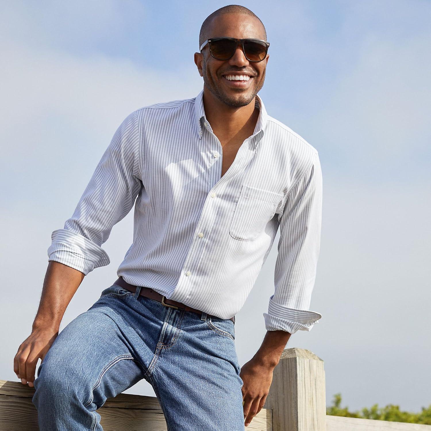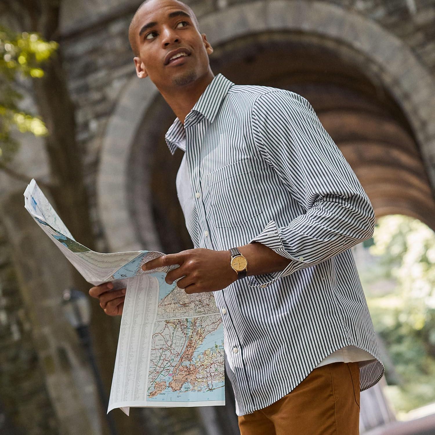 Lands’ End Men’s Traditional Fit Long Sleeve Travel Kit Shirt(Black/White Stripes)