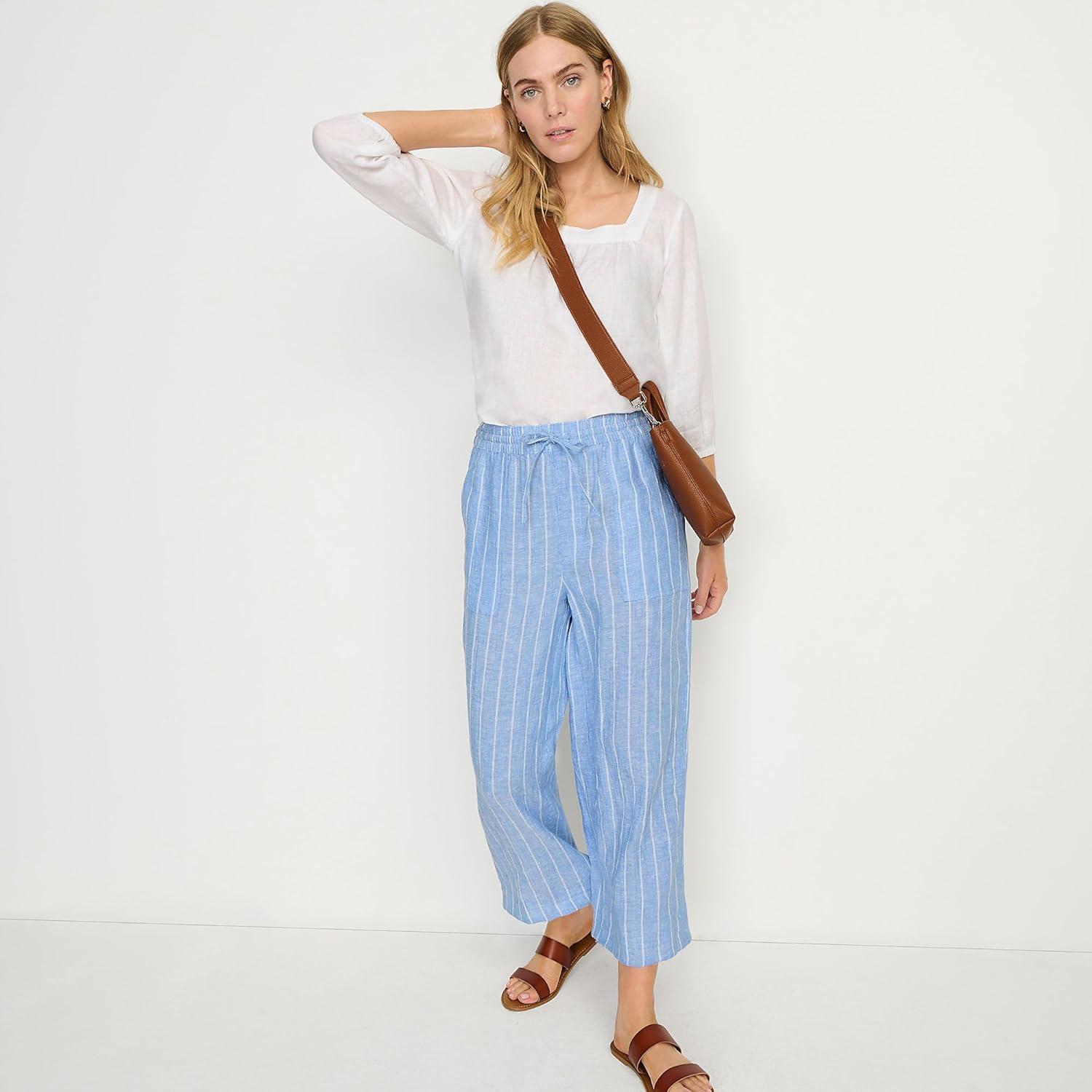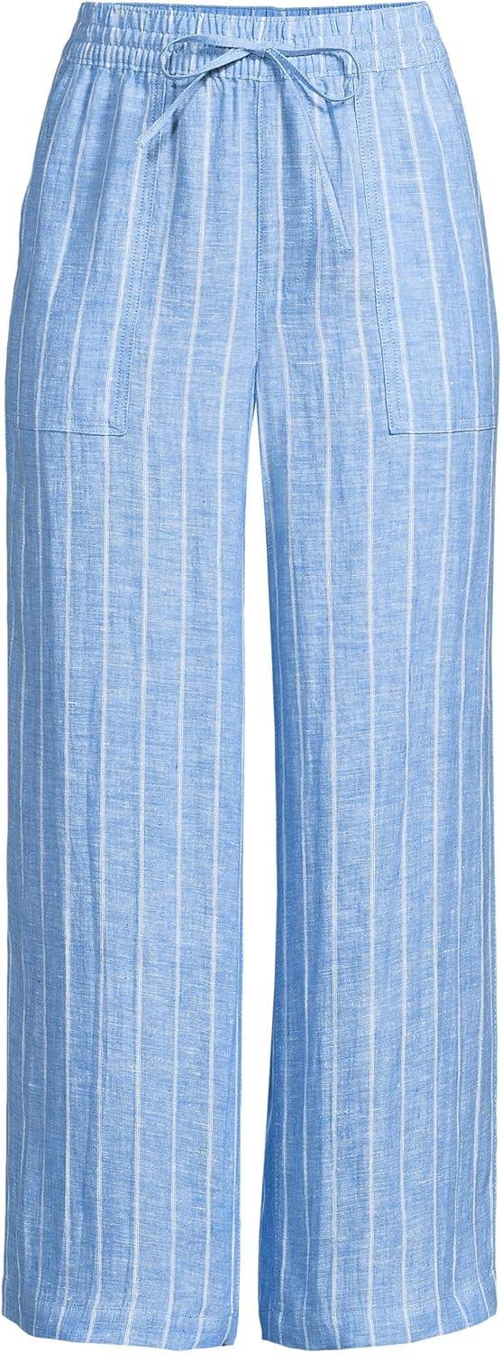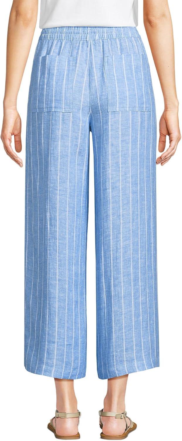 Lands’ End Women’s High Rise Pull On Drawstring Linen Wide Leg Crop Pants(Soft Blue Linen Stripe)