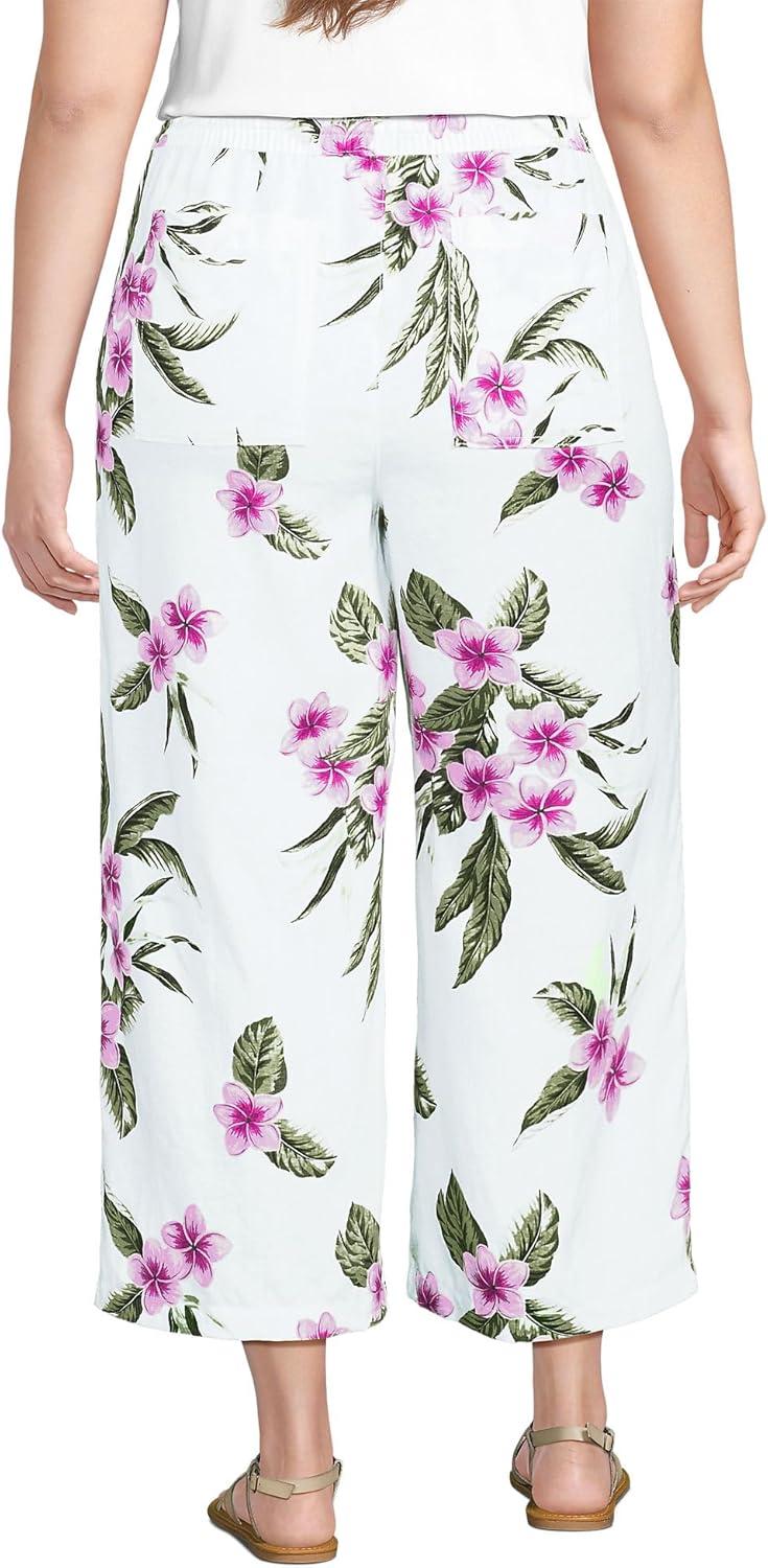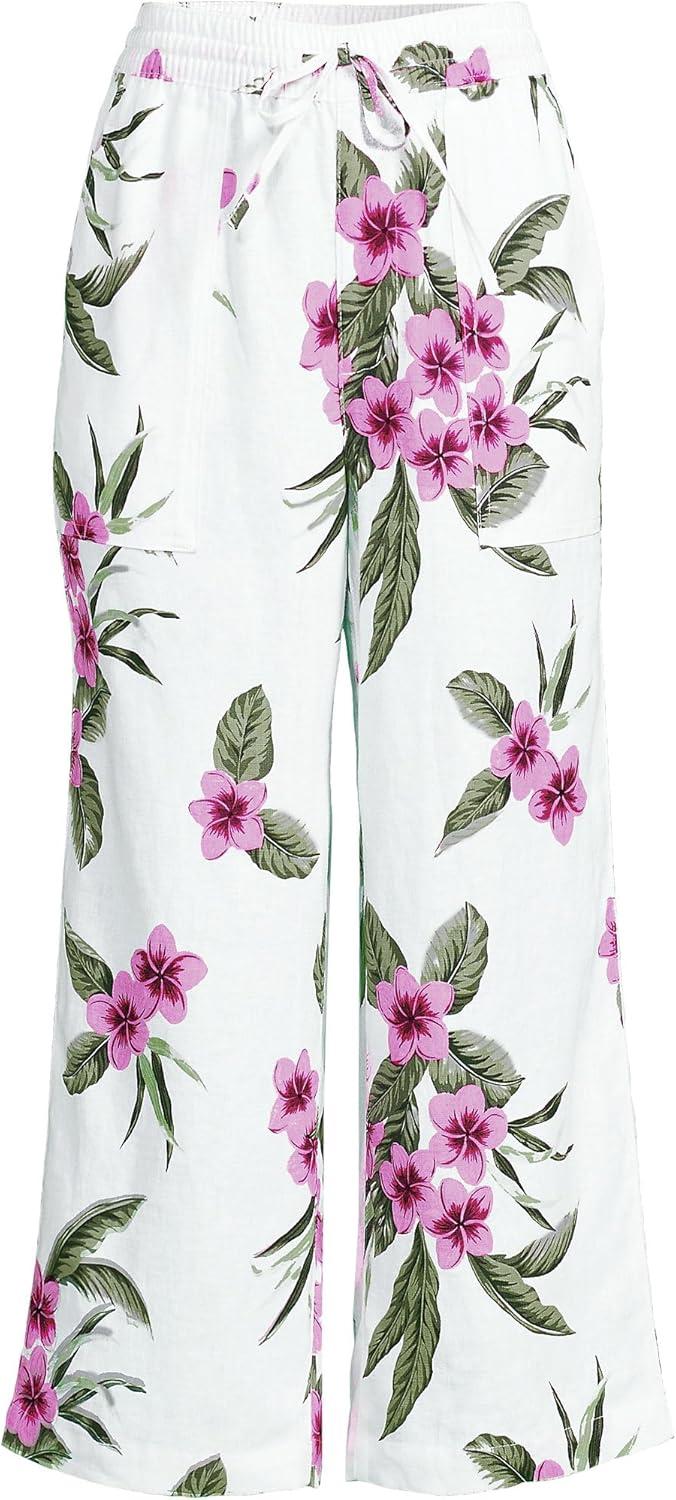 Lands’ End Women’s High Rise Pull On Drawstring Linen Wide Leg Crop Pants(White/Magenta Plumeria)