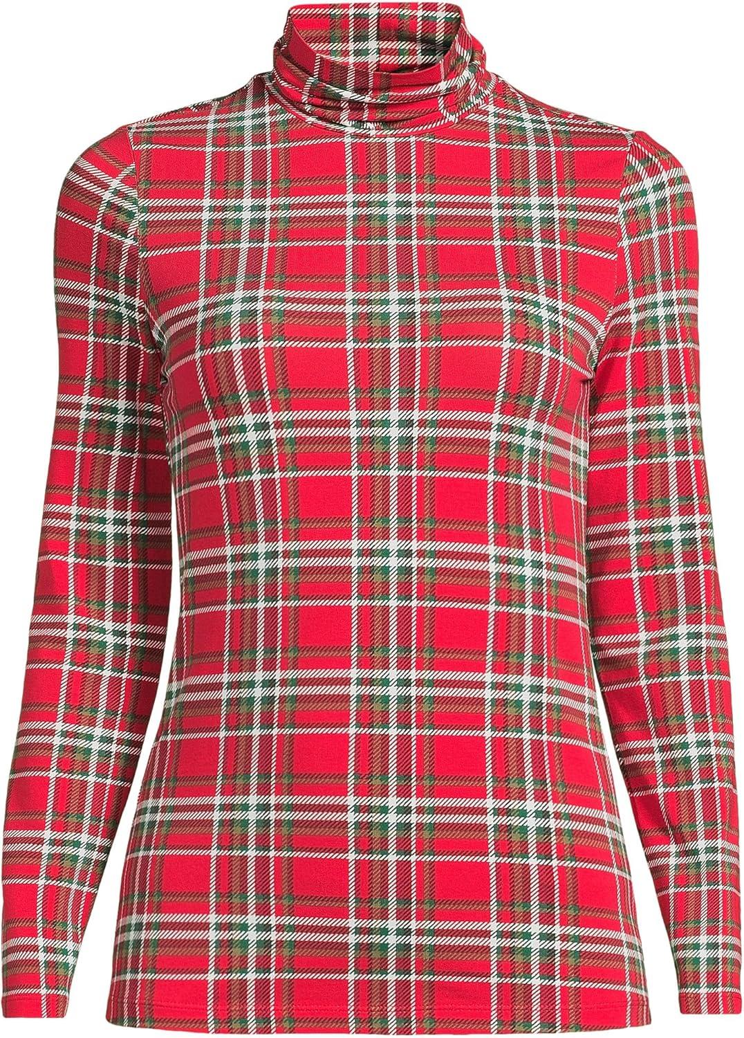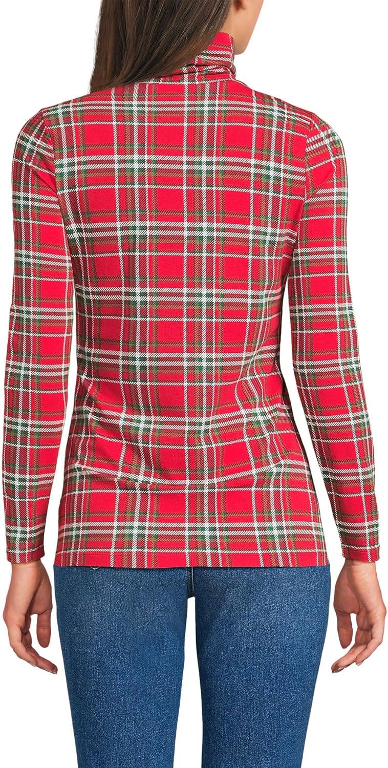 Lands’ End Lightweight Jersey Long Sleeve Turtleneck(Compass Red/Emerald Plaid)