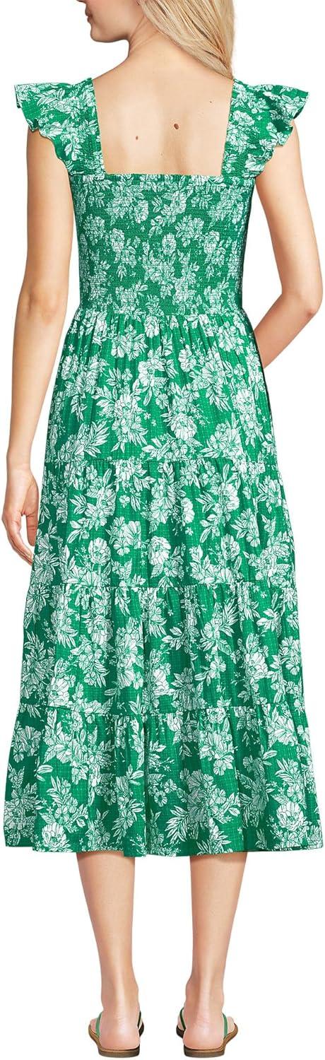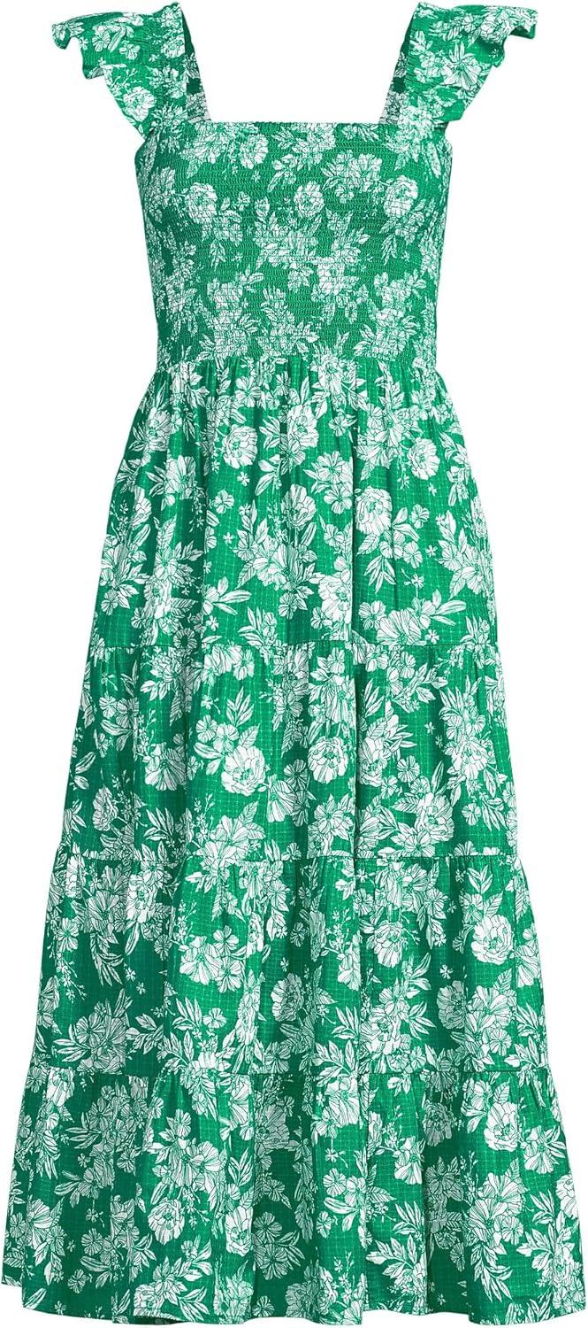 Lands’ End Women’s Chambray Smocked Dress with Ruffle Straps(Vibrant Clover Romantic Floral)