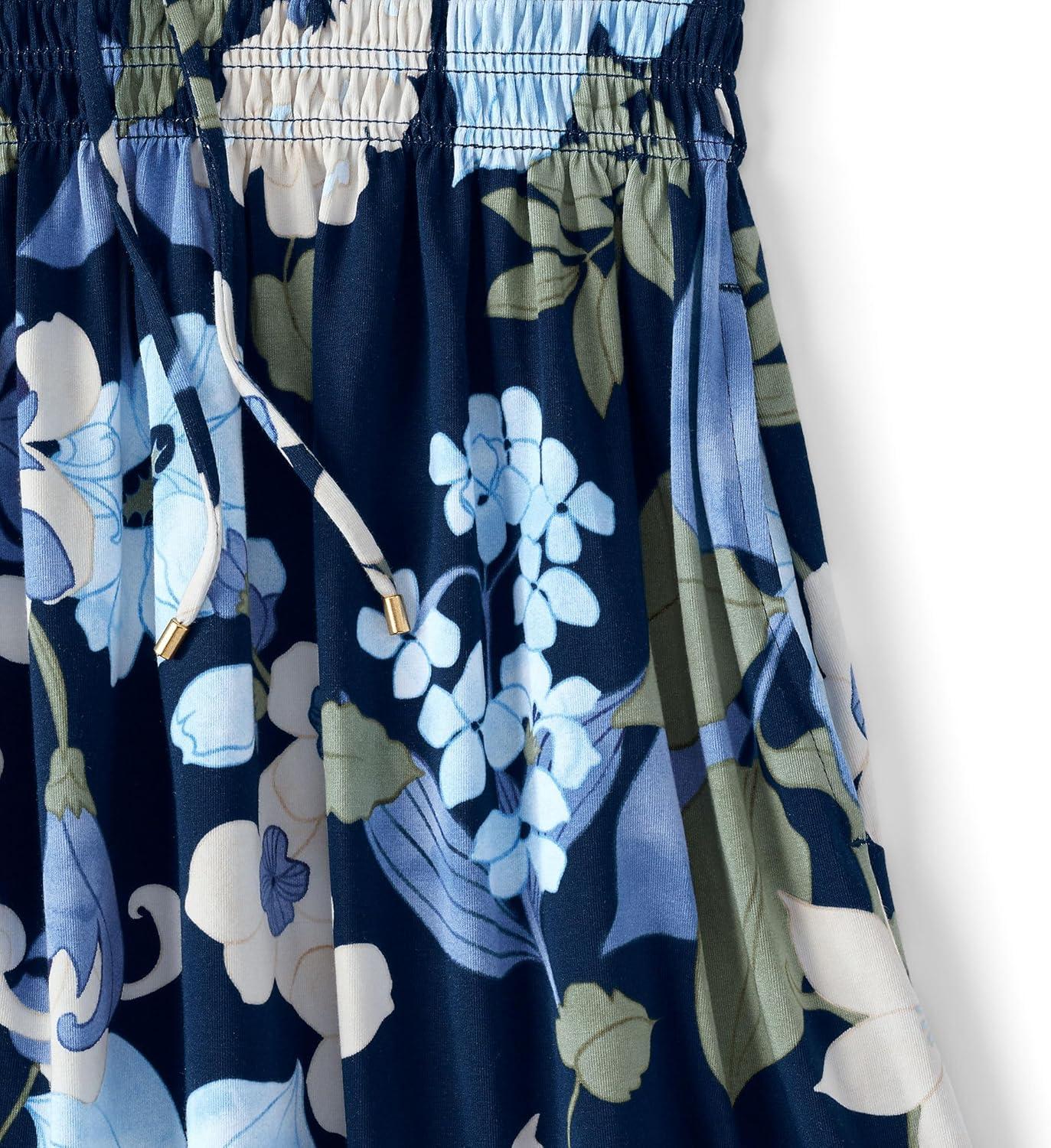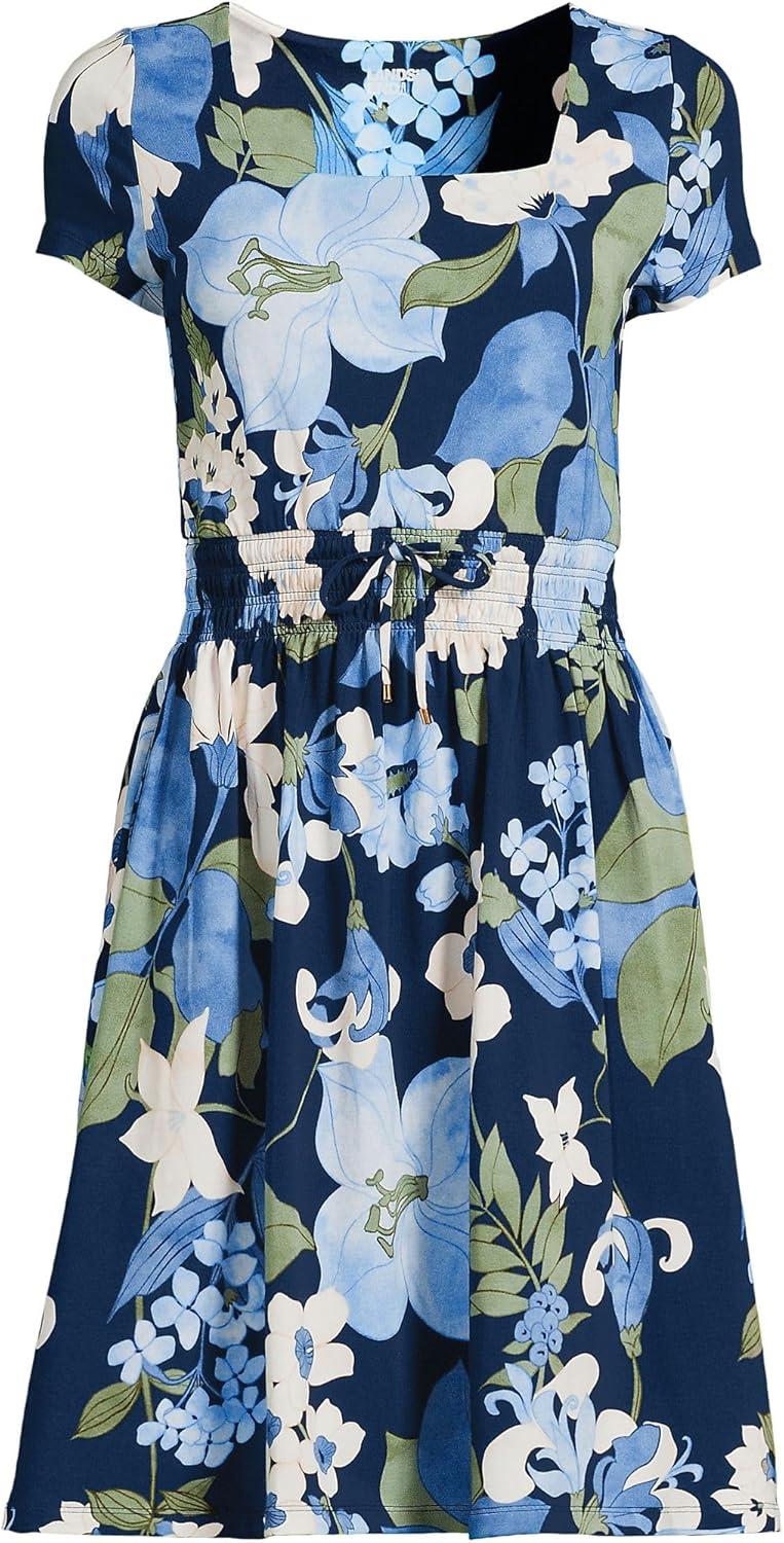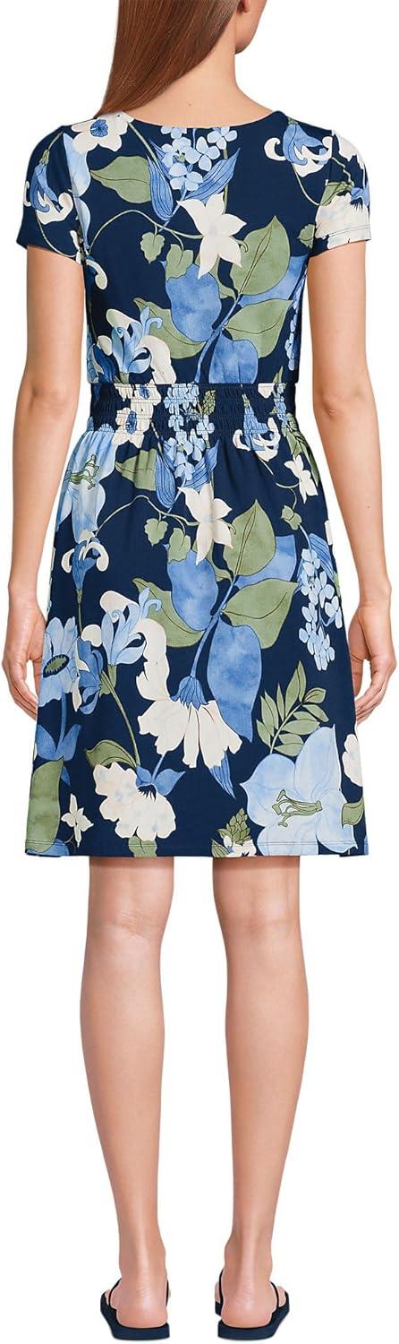 Lands’ End Women’s Cotton Modal Smocked Waist Dress(Deep Sea Navy Lilies)