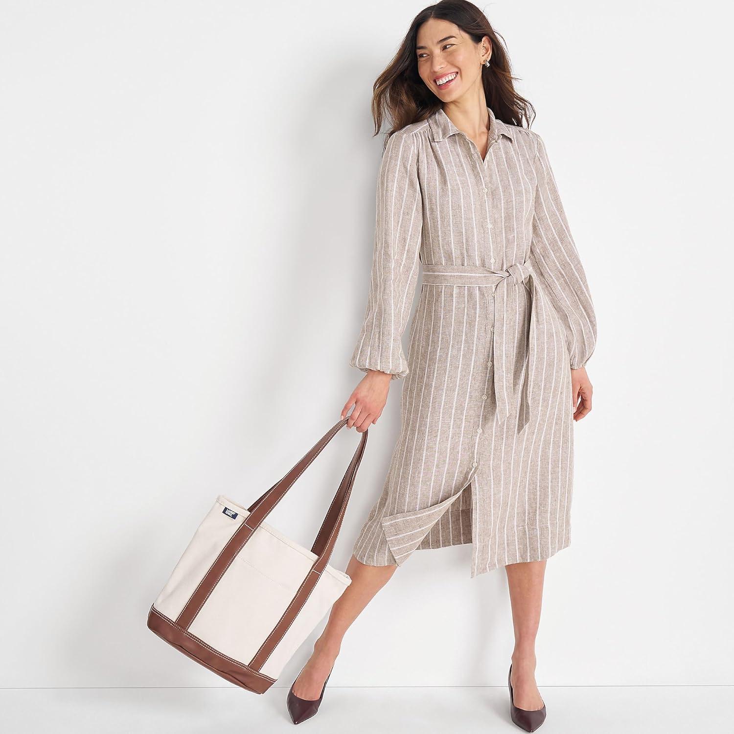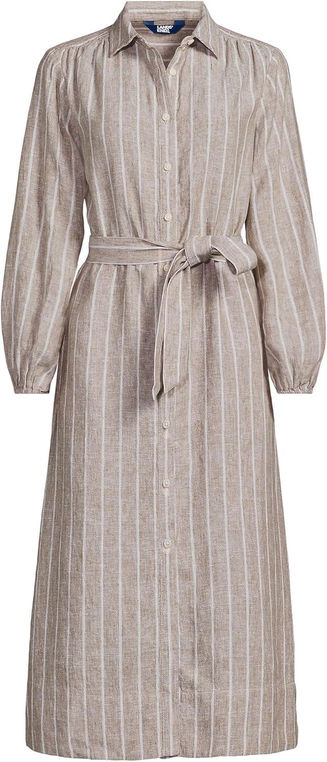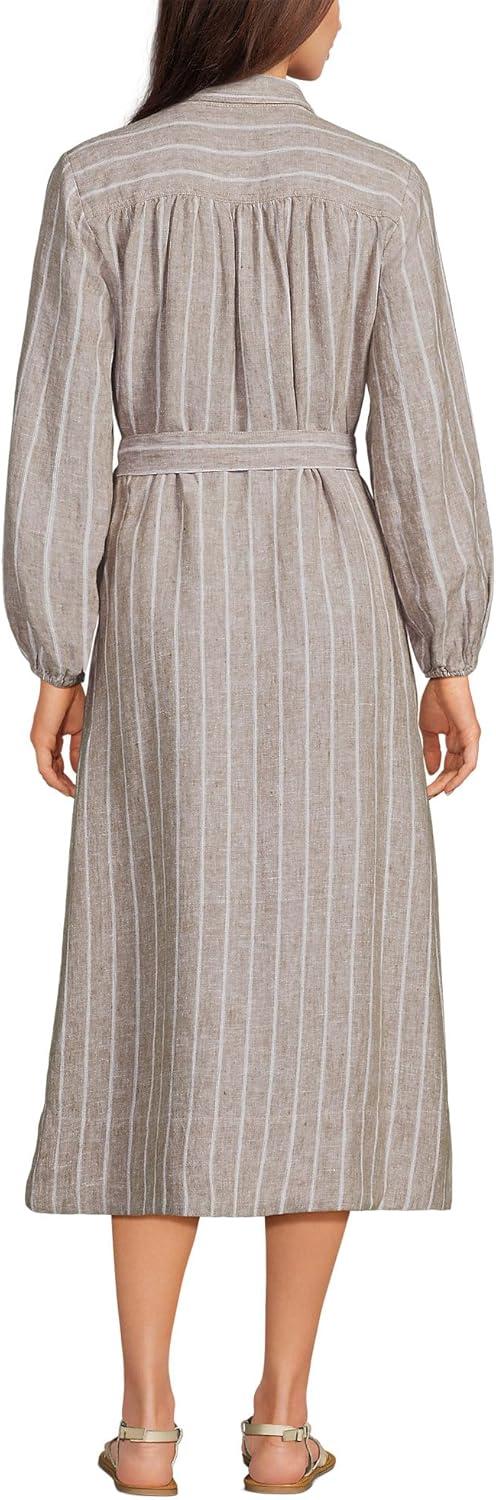 Lands’ End Women’s Linen Long Sleeve Midi Shirt Dress(Toasted Rye Stripe)