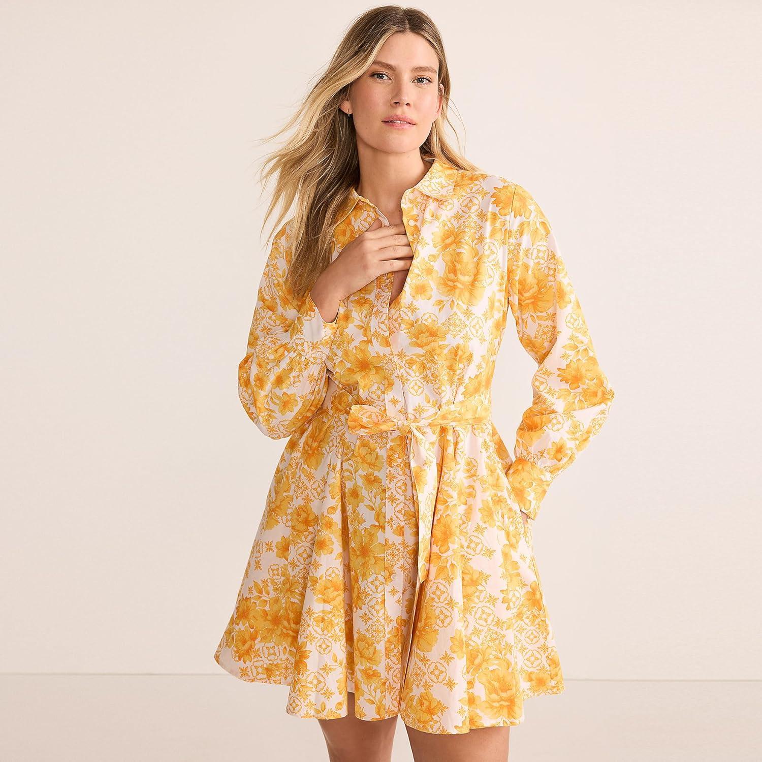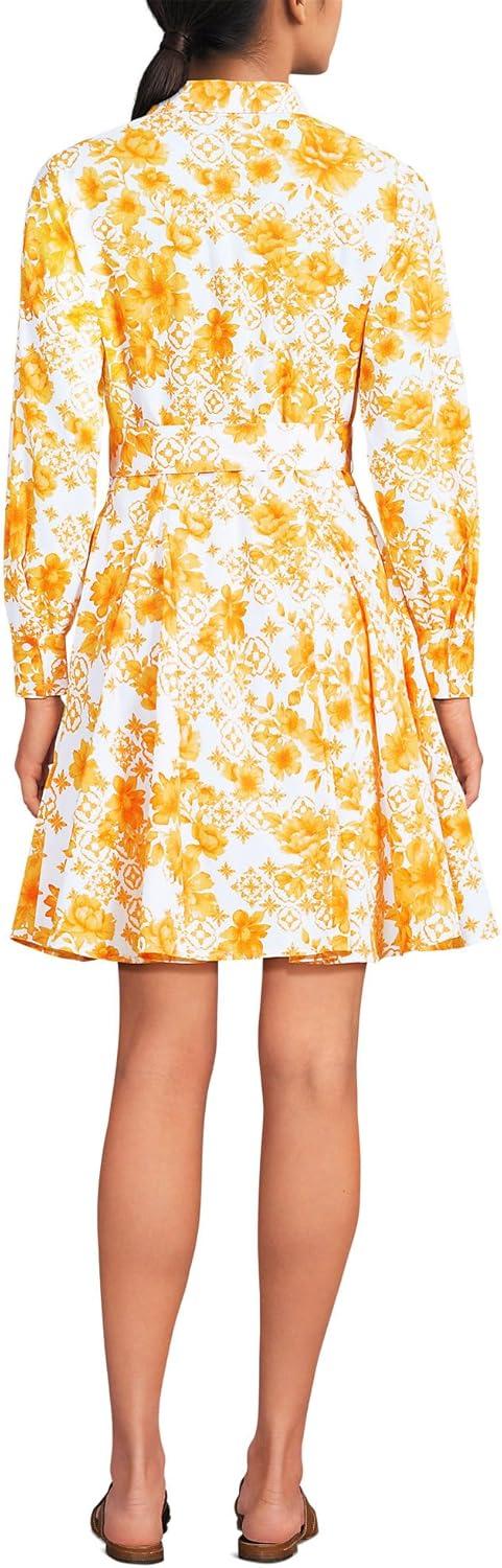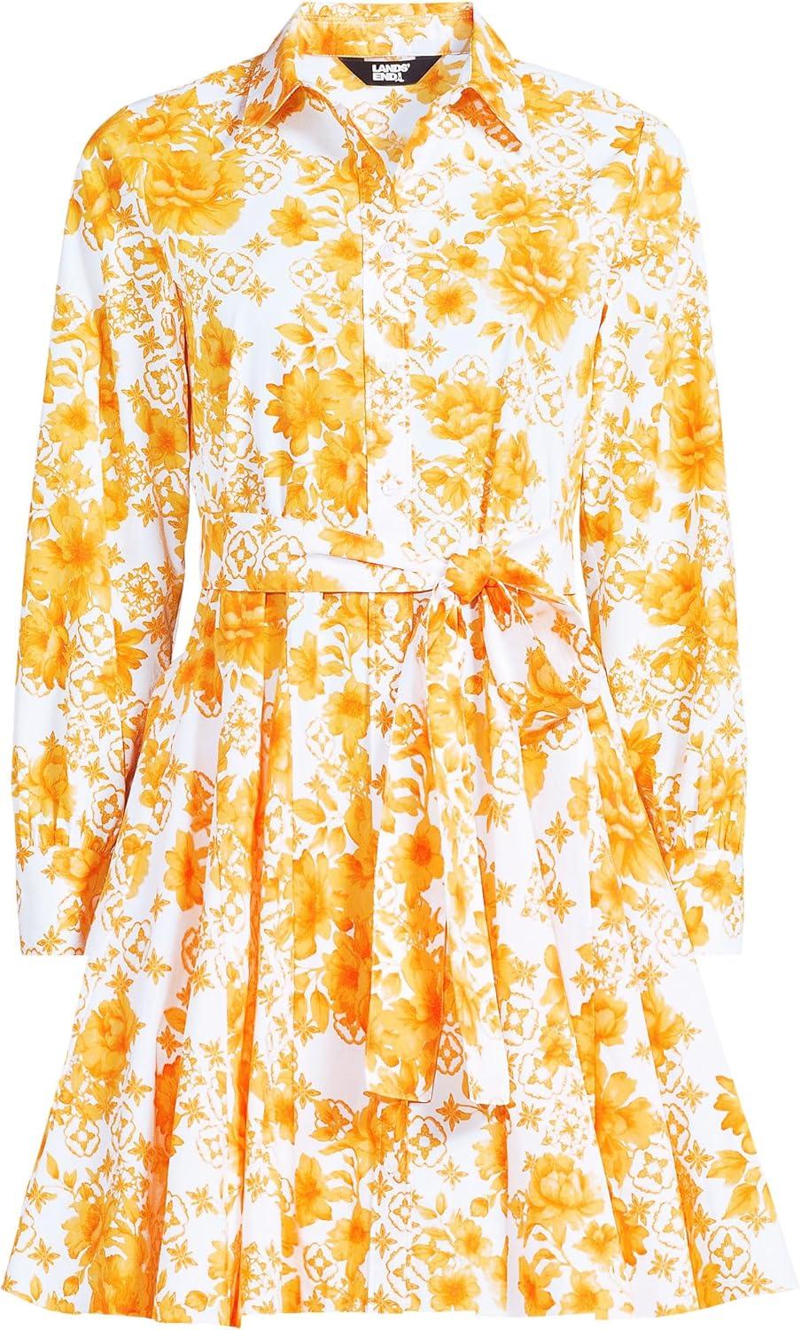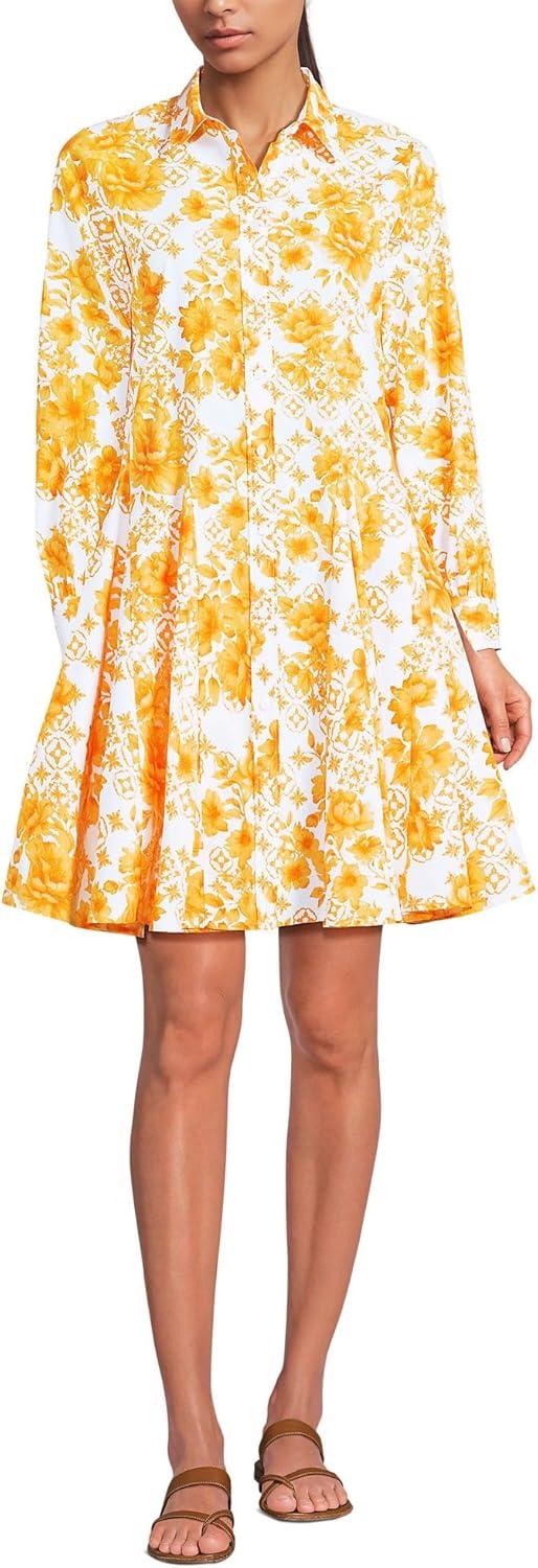Lands’ End Women’s Poplin Button Front Dress with Godets(Yellow Mosaic Floral)