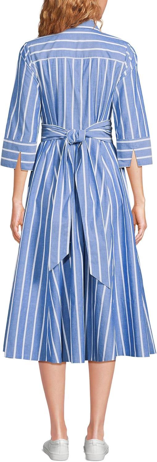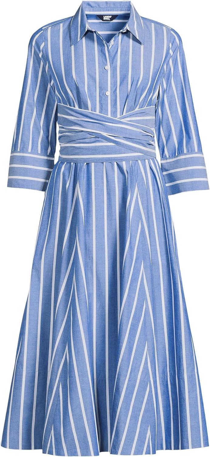 Lands’ End Women’s Poplin Midi Wrap Front Dress(Sapphire Gem Blue Broad Stripe)