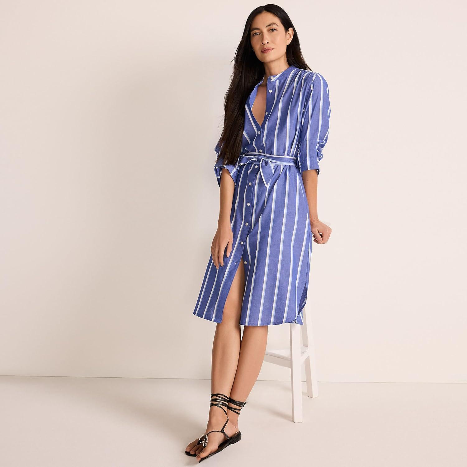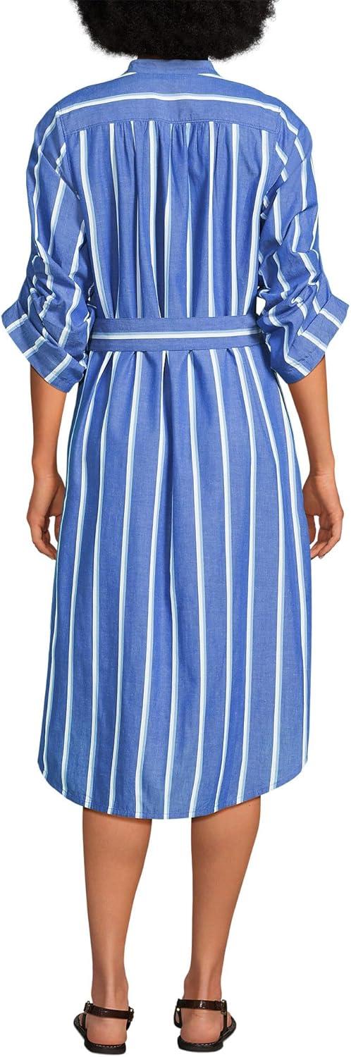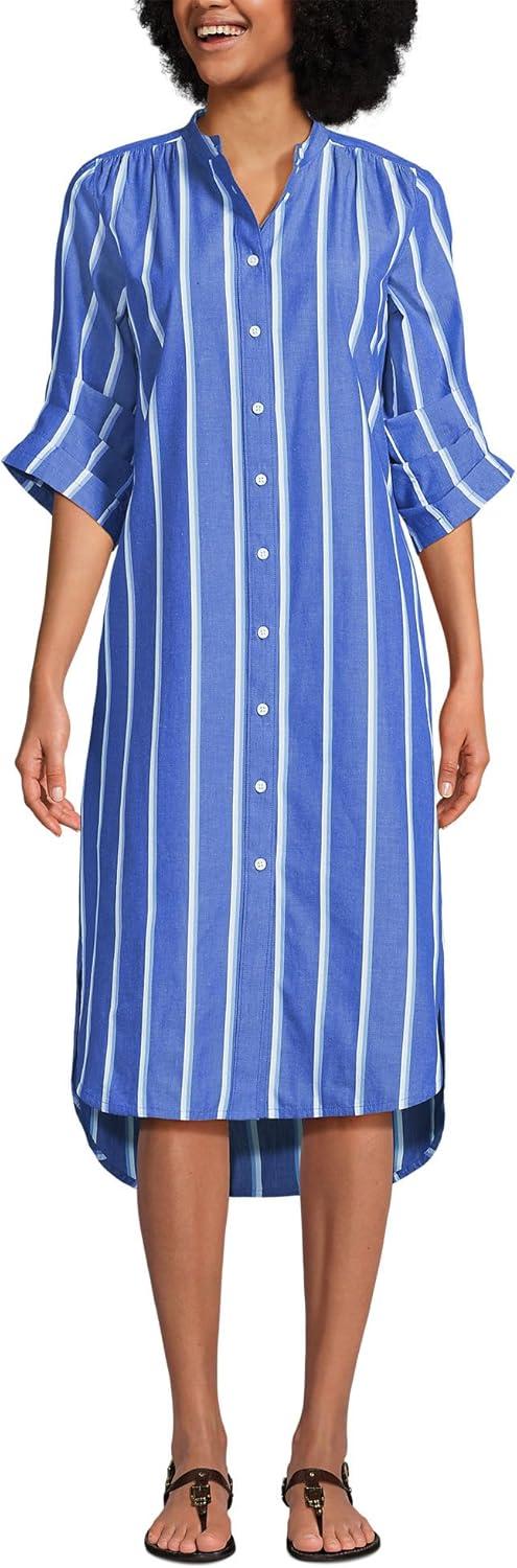 Lands’ End Women’s Poplin Oversized Puff Sleeve Midi Shirt Dress(Blue/White Shadow Stripe)