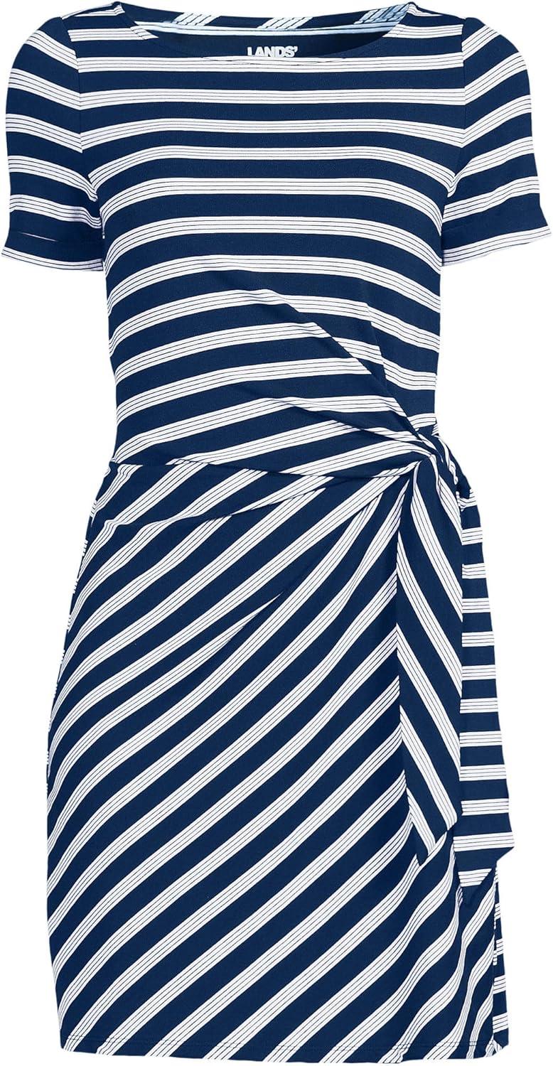 Lands’ End Women’s Short Sleeve Cotton Modal Wrap Mini Dress(Deep Sea Navy Quad Stripe)