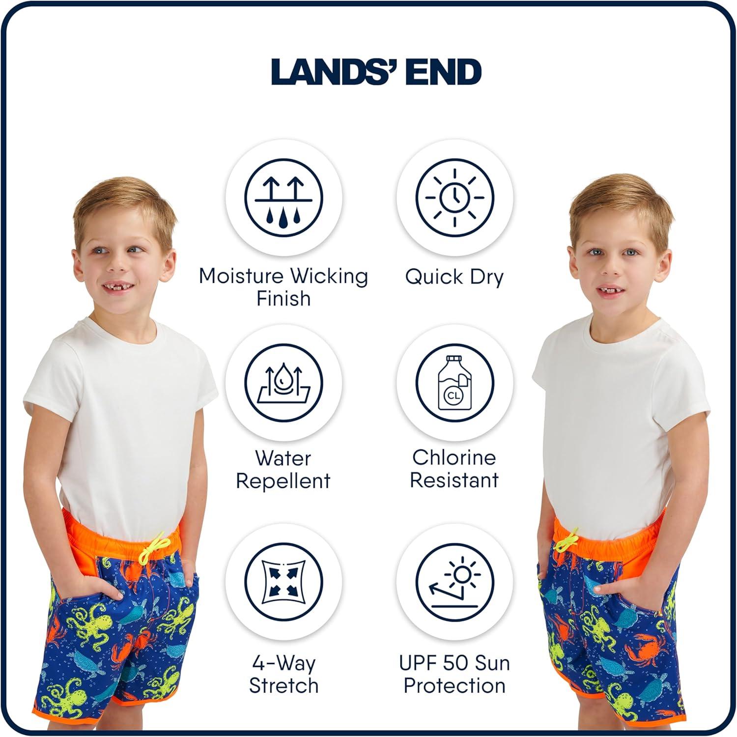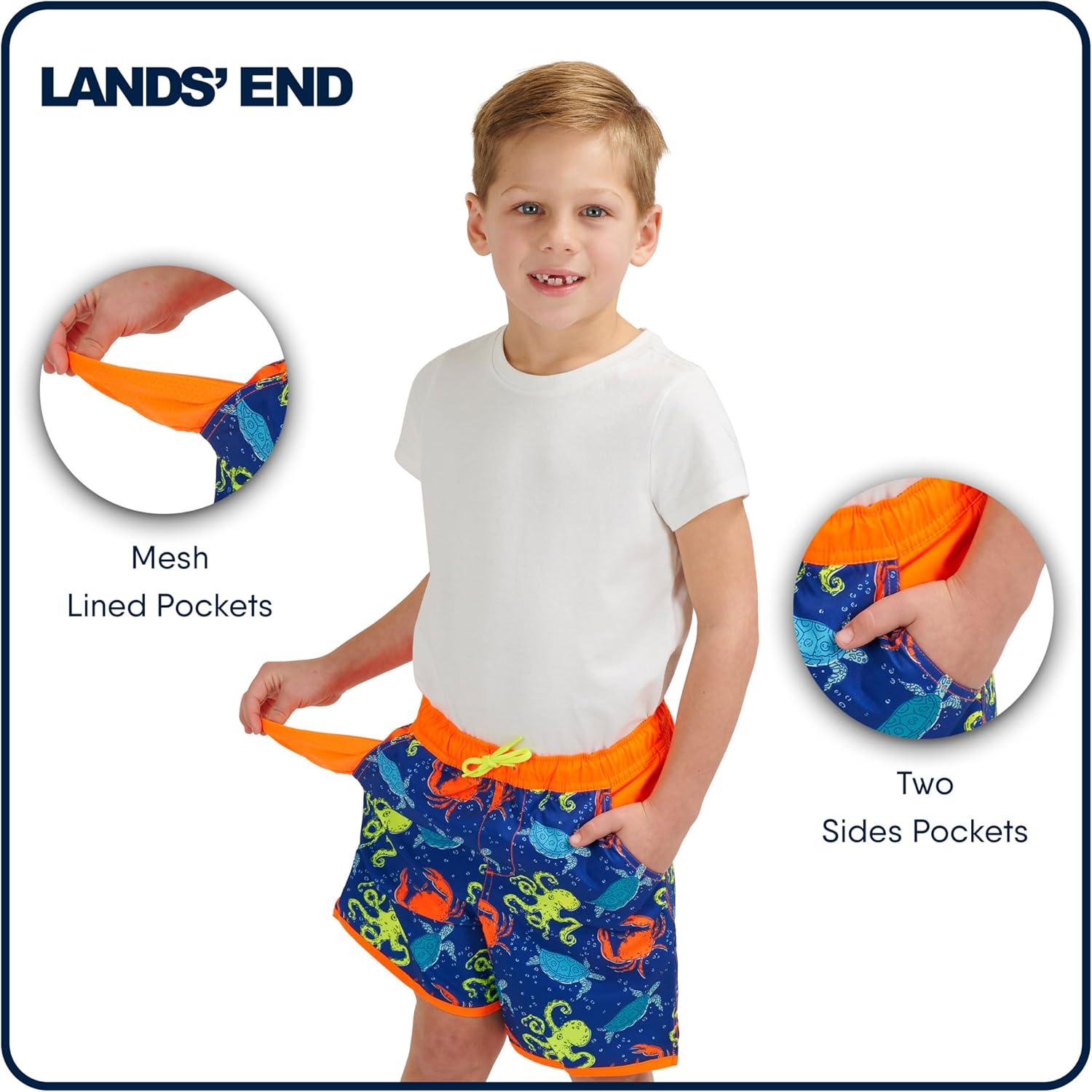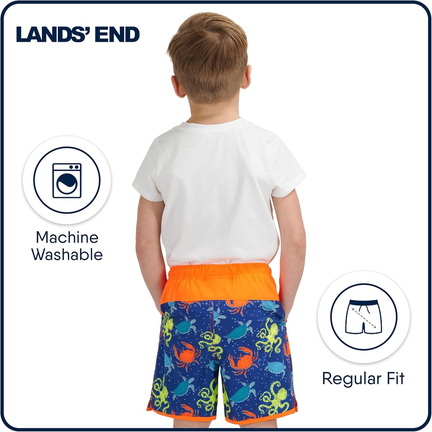 Let your little one make a splash in style and comfort with the Lands' End Boys' Swim Trunks. Designed with the brand's signature focus on both comfort and style, these quick-drying swim shorts are crafted to look good and feel even better. Whether he's building sandcastles on the beach, diving into the pool, or enjoying backyard water fun, these swim trunks provide the perfect blend of functionality and style, ensuring he's ready for any aquatic adventure. Experience premium quality with these chlorine-resistant swim trunks. The lightweight polyester shell and comfortable lining provide a super-soft feel that kids will love, while the stretchable waistband with drawstring ensures a secure and customizable fit. Convenient pockets add a touch of practicality, allowing him to keep small essentials close at hand. These swim trunks aren't just about comfort; they also offer UPF 50 sun protection, shielding him from harmful UV rays and keeping him safe during sunny days. These boys' swim trunks are designed with a regular fit and a 6″ inseam, providing comfortable all-day wear. Available in sizes Small, Medium, Large, and X-Large, they cater to a range of growing boys. For a more relaxed, roomier fit, consider sizing up. And when it's time for cleanup, these low-maintenance swim trunks are machine washable, making laundry a breeze. Simply toss them in the wash, and they'll be ready for their next water adventure. Combining premium quality, sun protection, and effortless care, these Lands' End swim trunks are the perfect choice for boys who love to make a splash.