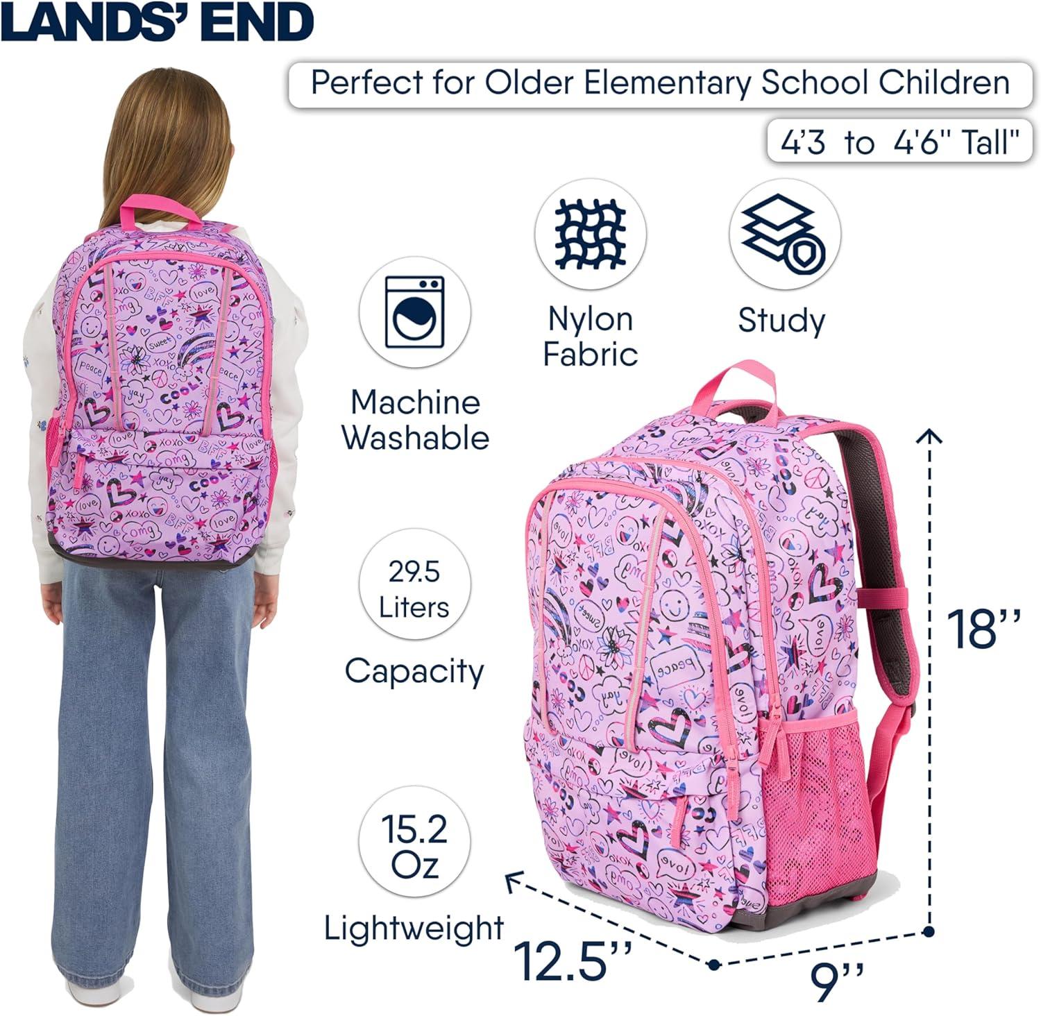 Since 1963, Lands' End has been a trusted name for classic American style, with a brand legacy built on quality and lasting durability. This backpack embodies that unwavering commitment by being the ultimate companion for your child's busy life. Perfectly sized for school, camping, travel, outings, playdates, and sleepovers, its spacious interior easily holds all the essentials. From school supplies and a lunch box to gym clothes, snacks, and toys, this backpack is ready for any adventure. This backpack is built for lasting performance, weighing just 15.2 ounces and made from a sturdy, high-quality reinforced nylon fabric. For a secure and comfortable fit, it features adjustable shoulder straps with PE foam padding and an adjustable chest strap with buckle closure. A reinforced top handle doubles as a convenient hand grip and wall hanger, while high-quality zippers provide easy access to the two-way zippered main compartment, a front pocket, and two mesh side pockets perfect for water bottles. The interior is designed to keep everything safe and organized. It includes a double padded laptop pocket measuring 12″ Wide x 13″ Deep for securely storing a small laptop or tablet, and two utility pockets perfect for holding pens, a small notebook, or a wallet. An interior name tag label is also featured for easy identification. With a generous 29.5 liter capacity (18″ x 12.5″ x 9″), this large backpack is perfectly proportioned for older elementary school children between 4.3' and 4'6″ tall.