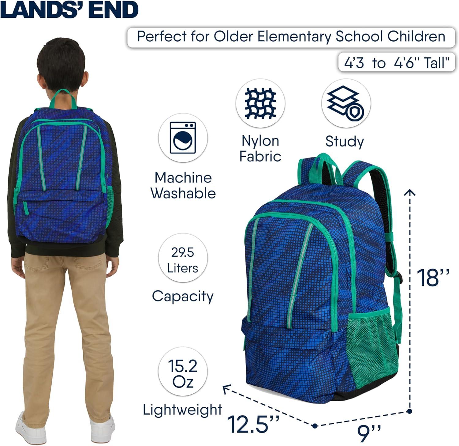 Since 1963, Lands' End has been a trusted name for classic American style, with a brand legacy built on quality and lasting durability. This backpack embodies that unwavering commitment by being the ultimate companion for your child's busy life. Perfectly sized for school, camping, travel, outings, playdates, and sleepovers, its spacious interior easily holds all the essentials. From school supplies and a lunch box to gym clothes, snacks, and toys, this backpack is ready for any adventure. This backpack is built for lasting performance, weighing just 15.2 ounces and made from a sturdy, high-quality reinforced nylon fabric. For a secure and comfortable fit, it features adjustable shoulder straps with PE foam padding and an adjustable chest strap with buckle closure. A reinforced top handle doubles as a convenient hand grip and wall hanger, while high-quality zippers provide easy access to the two-way zippered main compartment, a front pocket, and two mesh side pockets perfect for water bottles. The interior is designed to keep everything safe and organized. It includes a double padded laptop pocket measuring 12″ Wide x 13″ Deep for securely storing a small laptop or tablet, and two utility pockets perfect for holding pens, a small notebook, or a wallet. An interior name tag label is also featured for easy identification. With a generous 29.5 liter capacity (18″ x 12.5″ x 9″), this large backpack is perfectly proportioned for older elementary school children between 4.3' and 4'6″ tall.