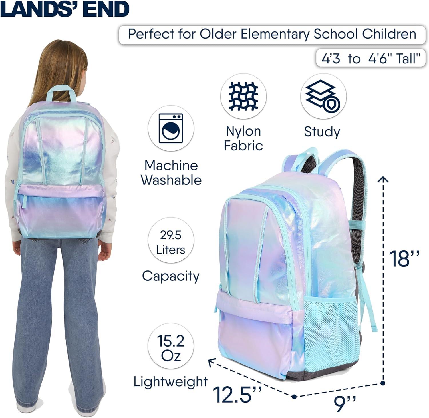 Since 1963, Lands' End has been a trusted name for classic American style, with a brand legacy built on quality and lasting durability. This backpack embodies that unwavering commitment by being the ultimate companion for your child's busy life. Perfectly sized for school, camping, travel, outings, playdates, and sleepovers, its spacious interior easily holds all the essentials. From school supplies and a lunch box to gym clothes, snacks, and toys, this backpack is ready for any adventure. This backpack is built for lasting performance, weighing just 15.2 ounces and made from a sturdy, high-quality reinforced nylon fabric. For a secure and comfortable fit, it features adjustable shoulder straps with PE foam padding and an adjustable chest strap with buckle closure. A reinforced top handle doubles as a convenient hand grip and wall hanger, while high-quality zippers provide easy access to the two-way zippered main compartment, a front pocket, and two mesh side pockets perfect for water bottles. The interior is designed to keep everything safe and organized. It includes a double padded laptop pocket measuring 12″ Wide x 13″ Deep for securely storing a small laptop or tablet, and two utility pockets perfect for holding pens, a small notebook, or a wallet. An interior name tag label is also featured for easy identification. With a generous 29.5 liter capacity (18″ x 12.5″ x 9″), this large backpack is perfectly proportioned for older elementary school children between 4.3' and 4'6″ tall.