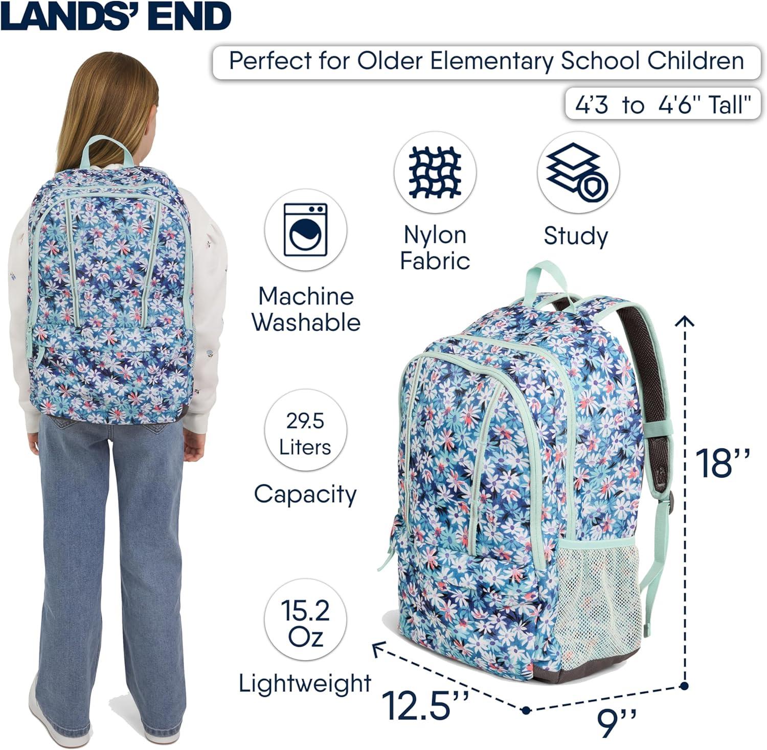 Since 1963, Lands' End has been a trusted name for classic American style, with a brand legacy built on quality and lasting durability. This backpack embodies that unwavering commitment by being the ultimate companion for your child's busy life. Perfectly sized for school, camping, travel, outings, playdates, and sleepovers, its spacious interior easily holds all the essentials. From school supplies and a lunch box to gym clothes, snacks, and toys, this backpack is ready for any adventure. This backpack is built for lasting performance, weighing just 15.2 ounces and made from a sturdy, high-quality reinforced nylon fabric. For a secure and comfortable fit, it features adjustable shoulder straps with PE foam padding and an adjustable chest strap with buckle closure. A reinforced top handle doubles as a convenient hand grip and wall hanger, while high-quality zippers provide easy access to the two-way zippered main compartment, a front pocket, and two mesh side pockets perfect for water bottles. The interior is designed to keep everything safe and organized. It includes a double padded laptop pocket measuring 12″ Wide x 13″ Deep for securely storing a small laptop or tablet, and two utility pockets perfect for holding pens, a small notebook, or a wallet. An interior name tag label is also featured for easy identification. With a generous 29.5 liter capacity (18″ x 12.5″ x 9″), this large backpack is perfectly proportioned for older elementary school children between 4.3' and 4'6″ tall.