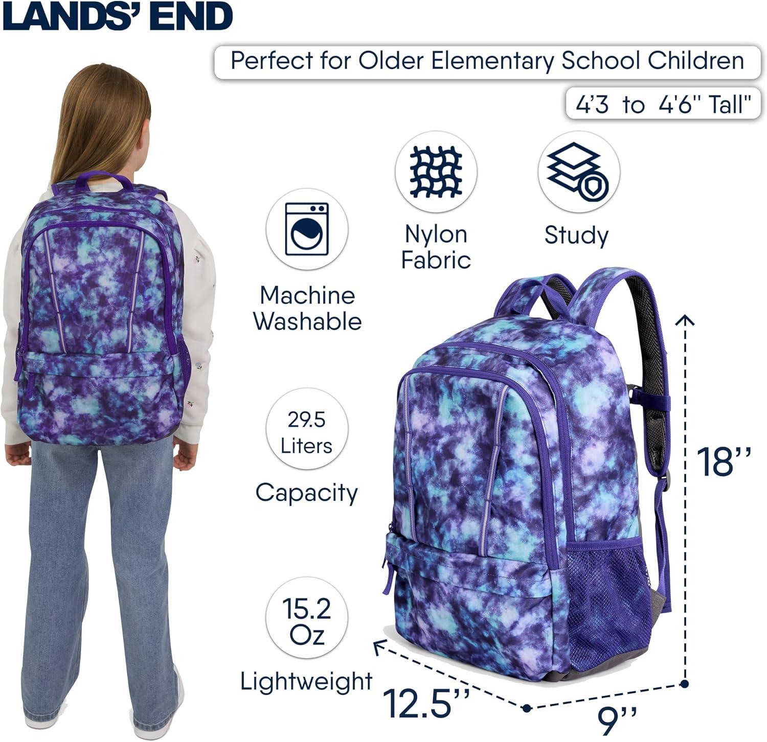 Since 1963, Lands' End has been a trusted name for classic American style, with a brand legacy built on quality and lasting durability. This backpack embodies that unwavering commitment by being the ultimate companion for your child's busy life. Perfectly sized for school, camping, travel, outings, playdates, and sleepovers, its spacious interior easily holds all the essentials. From school supplies and a lunch box to gym clothes, snacks, and toys, this backpack is ready for any adventure. This backpack is built for lasting performance, weighing just 15.2 ounces and made from a sturdy, high-quality reinforced nylon fabric. For a secure and comfortable fit, it features adjustable shoulder straps with PE foam padding and an adjustable chest strap with buckle closure. A reinforced top handle doubles as a convenient hand grip and wall hanger, while high-quality zippers provide easy access to the two-way zippered main compartment, a front pocket, and two mesh side pockets perfect for water bottles. The interior is designed to keep everything safe and organized. It includes a double padded laptop pocket measuring 12″ Wide x 13″ Deep for securely storing a small laptop or tablet, and two utility pockets perfect for holding pens, a small notebook, or a wallet. An interior name tag label is also featured for easy identification. With a generous 29.5 liter capacity (18″ x 12.5″ x 9″), this large backpack is perfectly proportioned for older elementary school children between 4.3' and 4'6″ tall.