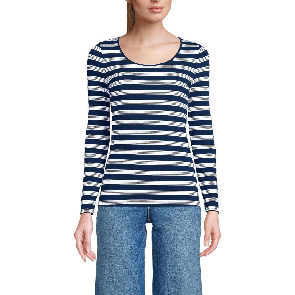 Lands’ End Women’s Long Sleeve Lightweight Jersey Scoop Neck T-Shirt(Deep Sea Navy Quad Stripe)