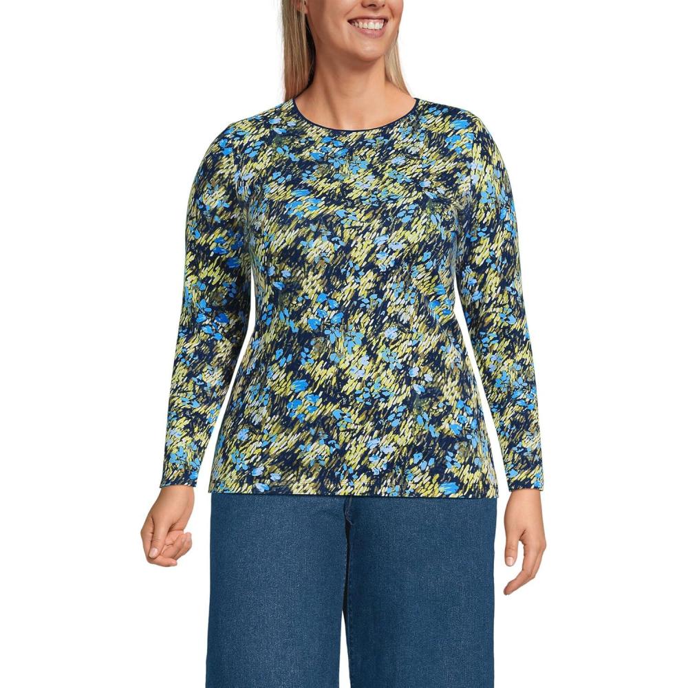 Lands’ End Women’s Plus Size Lightweight Jersey Skimming Long Sleeve Crew Neck T-Shirt(Navy Abstract Floral)